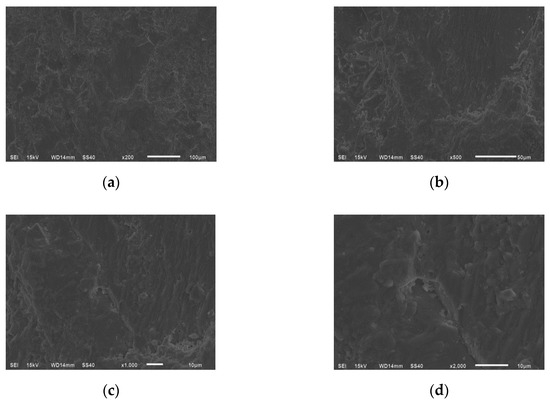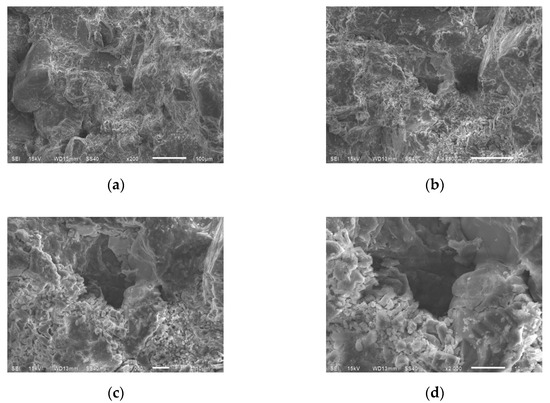 The structure of sandstone has obvious joint layered characteristics. The development of sandstone fractures has directionality. Due to the influence of geological movement and man-made mining activities, sandstone will also produce fractures, accompanied by small micro-fractures. SEM was used to observe the micro-crack structure development of three types of sandstone under four magnification (×200, ×500, ×1000, ×2000), as shown in Figure 5, Figure 6 and Figure 7.
