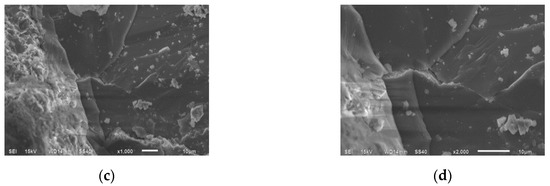 Micro-fracture development of the second type sandstone. (a) Meso-image with magnification of 200; (b) Meso-image with magnification of 500; (c) Meso-image with magnification of 1000; (d) Meso-image with magnification of 2000.