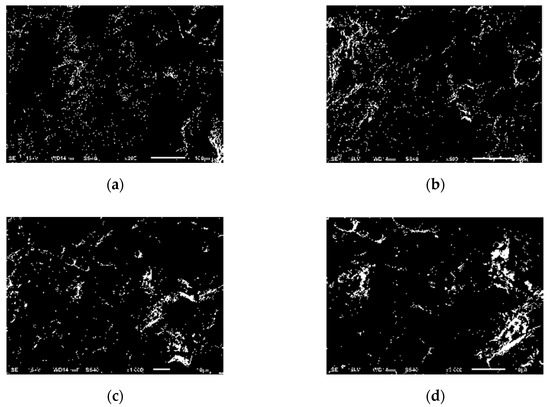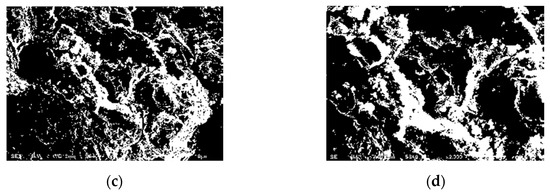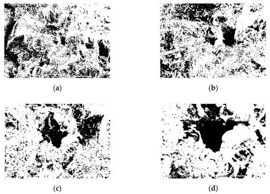 The binary diagram of the third kinds of sandstone. (a) Binary graph at 200 magnification; (b) Binary graph at 500 magnification; (c) Binary graph at 1000 magnification; (d) Binary graph at 2000 magnification.