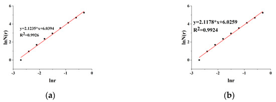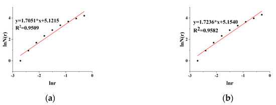 The fractal characteristics of sandstone meso-pore structure images are analyzed [40,41], and the obtained micro-images are processed into binary images by Matlab (Figure 8, Figure 9 and Figure 10). The image can be regarded as a numerical matrix of M × N. The data matrix is divided into several blocks with side length r. the box number occupied by black blocks in the matrix is calculated. Generally, r = 1, 2, 4, … 2i (i = 0,1,2,…). The logarithm of the box number and the box side length is taken, and the linear fitting is performed. The slope of the straight line is the fractal dimension of the image (Figure 11, Figure 12 and Figure 13). This step can also be realized by Matlab. In order to obtain a more accurate fractal dimension, take the average as the final fractal dimension, as shown in Table 1.
