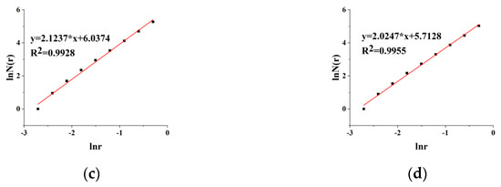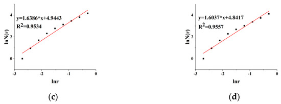 Fractal dimension fitting diagram of the third type sandstone. (a) Fitting diagram at 200 magnification; (b) Fitting diagram at 500 magnification; (c) Fitting diagram at 1000 magnification; (d) Fitting diagram at 2000 magnification.
