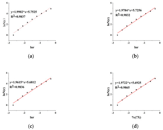 Fractal dimension fitting diagram of the first type sandstone. (a) Fitting diagram at 200 magnification; (b) Fitting diagram at 500 magnification; (c) Fitting diagram at 1000 magnification; (d) Fitting diagram at 2000 magnification.