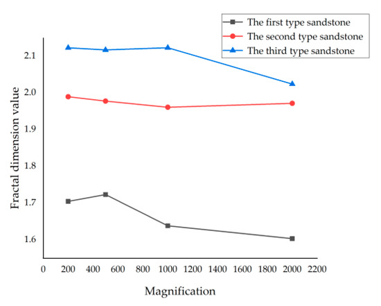 By observing the change in fractal dimension under different magnification (Figure 14), it can be found that with the increase in image magnification, the calculated fractal dimension generally shows a decreasing trend. The analysis is that with the increase in image magnification, the observable rock surface range decreases, so the number of observable pores will also decrease, and the complexity of surface structure will decrease, so the fractal dimension will decrease. At the same time, the fractal dimension values of different types of sandstone are also different.