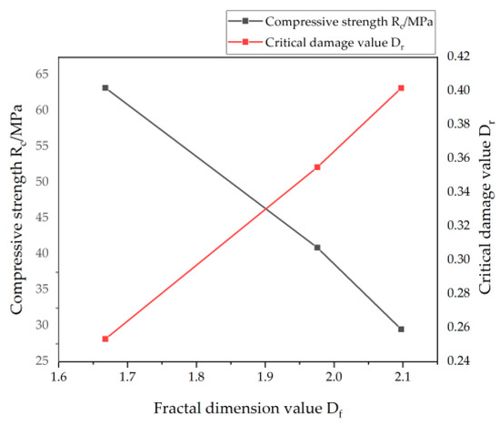 According to Table 3 and Figure 16, the fractal dimension of sandstone is directly proportional to the critical damage. The larger the fractal dimension is, the stronger the self-similarity of sandstone is and the more complex the internal structure is, and the smaller the macro-strength parameter is, the greater the internal damage of sandstone is, which is consistent with the actual situation. On the contrary, the smaller the fractal dimension, the smaller the critical damage.
