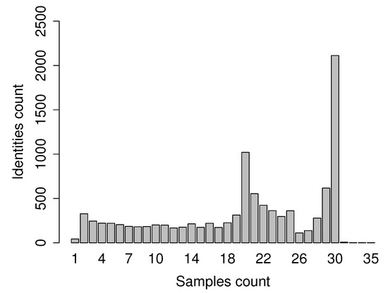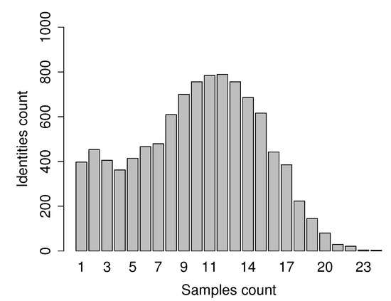 In the case of the CASIA-WebFace data set, the highest accuracy for classification algorithm trained on ground truth data was obtained for SVM, equal to . Application of PCA dimensionality reduction slightly improved the accuracy in the case of NN (by 0.001). In other cases, it either remained the same as it was for the 62-dimensional data set or had a smaller value.