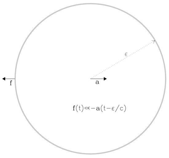In order to understand the genesis of the difference between Equations (6) and (9), which respectively are at the retarded and real times, we compute the rate of work done by the self-force of an accelerated charge. We consider the charge to be in the shape of a spherical shell of a sufficiently small radius , though, as we shall see, the final results sought by us will be independent of the value of . We compute the force on each infinitesimal element of the charged shell due to the time-retarded fields from the remainder parts of the shell and perform a double integration over the shell to get the total self-force on the charge [1]. The net self-force at a time t on the accelerated charged spherical shell of radius turns out to be proportional to the acceleration it had at a retarded time (Figure 1) [23].