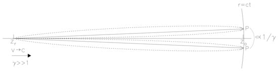 As is well known, for a charge moving relativistically with a uniform velocity, the electric field component perpendicular to the direction of motion is stronger by a factor relative to the component along the direction of motion, with the field lines becoming oriented perpendicular to the direction of motion [1,2,3]. Moreover, for a large , the field becomes negligible, except in a narrow zone along the direction of motion, with the field lines confined mostly within a small angle, , with respect to a plane normal to the direction of motion and passing through the ‘present’ charge position [29].