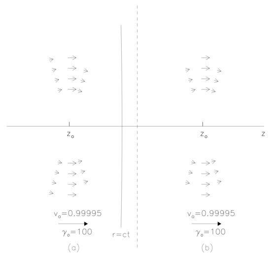Now if we plot the electric field (Equation (34)) of the uniformly accelerated charge, for a large , which also implies and , and compare it with the field (Equation (35)) of a charge moving with the same, but a uniform, velocity and thus having the same , we find that the fields are quite similar in both cases. Figure 3 shows a comparison of the electric fields in both cases for , corresponding to . In both cases fields are very similar and extend, from the “present” charge position, in direction normal to the direction of motion.