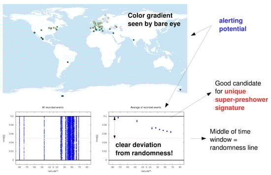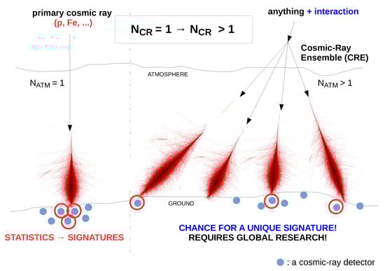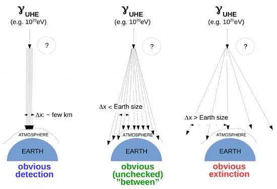 On the other hand, if a CRE particle distribution is so sparse that only one particle can reach the ideal detector system at a time, there is no technical chance to interpret this individual particle as a component of a CRE. Thus, we consider this scenario an obvious technical limitation for CRE observation, in Figure 4 named “obvious extinction” (right panel). Consequently, the focus of any research dedicated to CRE is limited to the scenarios that can result in particle distributions less sparse than the “obvious extinction” limit, as also illustrated in Figure 4 with the “obvious between” CRE case (middle panel), so far unexplored with a globally coordinated observational effort.