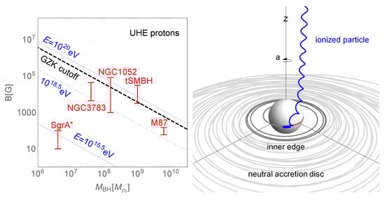 Left: constraints on the SMBH mass and magnetic field for UHE protons and chosen nearby sources (at the distance Mpc from the Solar system) fitting UHECRs of certain energy. Data is taken from [104,105,106,107,108,109], tSMBH source corresponds to a typical SMBH of mass and magnetic field G. Right: numerical simulation of a decay (ionization) of a freely falling neutral particle (grey thick) into two charged fragments in the vicinity of a rotating black hole immersed in an external magnetic field. Positively charged fragment (blue) is accelerated by the black hole and escapes to infinity along the symmetry axis. Negatively charged fragment (red) ultimately falls into the black hole, extracting its rotational energy (see, details in [100].)