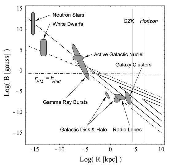 These results are summarized in Figure 3. All the curves, except for two dotted ones, correspond to protons (), and the dotted are for iron nuclei (). The details are discussed in the figure caption. Here we make a few important conclusions. First, there is an absolute maximum energy of UHECR accelerated electromagnetically and subject to radiative losses (e.g., in dipolar magnetospheres, galactic and extragalactic shocks and such), which is given by the balance of the acceleration and losses. This puts the upper limit on the magnetic field strength, given by the dot-dashed horizontal line and by Equation (13):