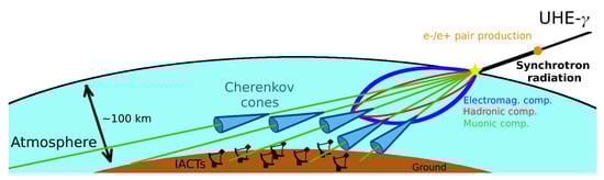 Schematic view of the preshower effect observed by gamma-ray telescopes; in the geomagnetic field, an ultra-high-energy photon is converted into an pair, which radiate synchrotron photons. A CRE composed of thousands of photons and a few electrons/positrons reaches the top of the atmosphere within a few square centimeters. An EAS is subsequently produced and, due to the high zenith angle observation mode, the electromagnetic and hadronic components are mostly absorbed. The surviving muonic component emits Cherenkov radiation which can be detected by ground-based Imaging Cherenkov Telescopes [153].