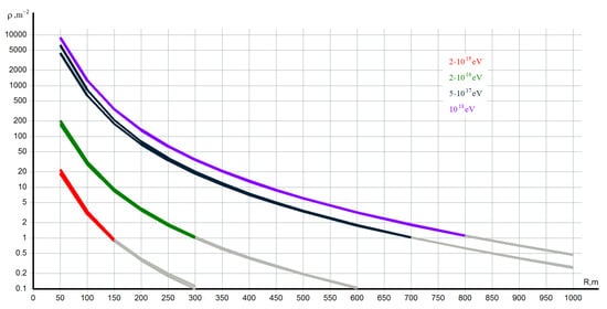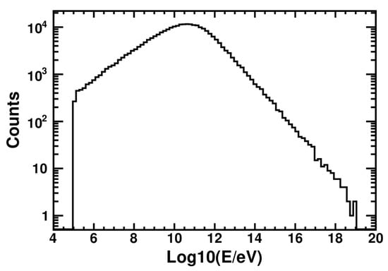 This example shows that by analyzing the properties of CRE/SPS one might approach attributing a non-trivial physical scenario to the observable event category, provided the underlying uncertainties are properly understood and quantified—as planned by CREDO. The few calculations performed so far in this direction can still serve only as qualitative indications concerning potential CRE/SPS observables. For instance, in Ref. [157] the lateral spread of an SPS originated nearby the Sun is simulated using a private code, assuming that an SPS is composed only of photons of energies larger than E = 10 eV. A more detailed calculation reported in Ref. [152] and obtained using an open source public code (PRESHOWER [151,156]) shows that the energy spectrum of SPS particles might extend down to even quite low energies, with a peak at around 10 GeV, as illustrated in Figure 6. TeV photons would certainly induce air showers that would contain particles, mostly muons, observable on the Earth’s surface. While in large cosmic-ray observatories these muons are treated as background, the complete CRE/SPS-oriented research we propose here has to include a proper handling of this “unwanted muon background” which can be processed to extract a signal induced by ensembles of low-energy air showers arriving simultaneously at the detector—very clear, unique, and so far untested signature. We make one step further and propose a global analysis of the data from the available detectors to search for extremely spread CRE/SPS events, inaccessible by the largest observatories taken individually. The experimental question which can be addressed in this regard is: “which CRE/SPS fronts, and in which circumstances, can be detected by a network of devices located on Earth or around it?”. It is the question about the SPS/CRE particle density on the top of the atmosphere (or speaking more general: on top and within the technosphere) and the particle density, or any other observable information, such as e.g., Cherenkov light, related to the resultant air shower ensembles.