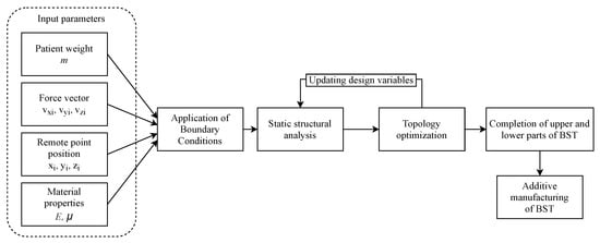 The new procedure begins when the patient after amputation undergoes an orthopedic examination. The orthopedist prepares input parameters for modeling, such as the weight m and position of the center of gravity. Subsequently, boundary conditions (i.e., external forces acting on the prosthesis) are calculated while using weight. The calculated forces are then used as the input for the computational model using FEM. We assumed that the FEM analysis can be used to perform static structural analysis of BST within each individual stage of the gait, applying forces as boundary conditions describing the static load on the BST. We also assume that BST material can be described by linear elastic behavior, which only requires two input parameters, Young’s modulus E and Poisson’s ratio . The assembled model is then optimized through the topology optimization method (TOP). It should be noted that the static structural analysis combined with TOP creates a loop with termination criteria. After finding an optimal distribution of the material in the lower part of the BST, the lower part is combined with the mapped upper part of the BST. Once the shape of the entire BST is defined, it is ready to be produced by additive manufacturing (AM) offering high geometrical freedom when compared to traditional manufacturing. Once produced, the prosthesis is ready to use. The procedure is depicted in a diagram, see Figure 3.
