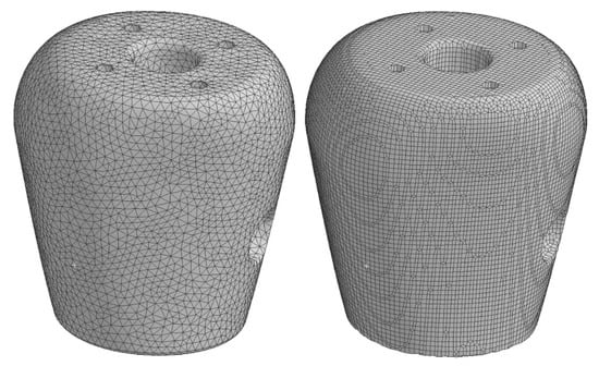 Finite element meshes used for description of the BST lower parts, tetrahedral (left) and hexahedral (right) elements.