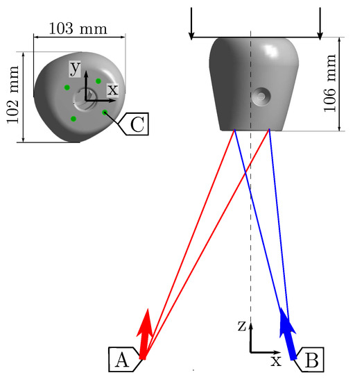Boundary conditions of the BST lower part, A—force from toe, B—force from heel, and C—fixture in holes.