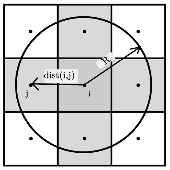 where R is the radius of the filter and is the operator calculating the distance between the i-th and j-th elements. This means that, if the distance is greater than the radius, then the weight factor is zero. If the distance is zero, the weight factor has a value of the radius. In a two-dimensional (2D) problem, the radius forms a circle, see Figure 7 and in a 3D problem, it creates a sphere.