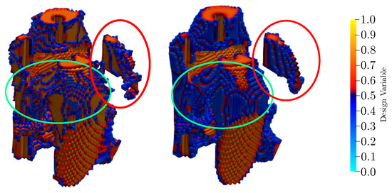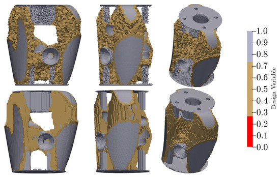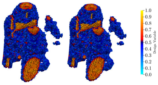Elements in brown do not fully participate in the stiffness (partially at best). The number of these elements can be controlled by the designer. A fine line between the value of the objective function and the constraint function has to be established (lower number of elements leads to the volume minimization, but the structure can become compliant). The third color (red) is not present in Figure 8 because the limit of the design variable was set to 0.30. Anyway, these elements should be removed since they do not help carry the structure. The settings were the same for all analyses (unless otherwise stated). In the first analysis, the used mesh was the only difference. The results look similar, which means that results from the proposed design procedure (processed using MATLAB code) are not dependent on the mesh.
