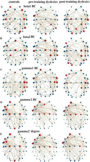 The simultaneous appearance of hubs in the left inferior frontal lobe and the visual word-form area, which is present in the controls (β1, γ2) and the post-training dyslexics (β2), are not observed in pre-training children with dyslexia (β1, β2). It might be associated with reading development [70]. The absence of hubs adjacent to the Heschl’s sulcus in pre-training children with DD (β1) has been found to be an early sign of dyslexia in other studies [42].
