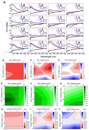 CD and UV imaging spectra for 3 sets of PVA film coated in 1% (w/v) of D-dopa. (A) CD with inserted UV spectra of each grid point of the 4 × 4 grid at 5 mm interval steps for Set 1 (black), Set 2 (red) and Set 3 (blue), respectively. Two-dimensional (2D) maps of CD at 285 nm for (B) Set 1, (C) Set 2 and (D) Set 3; UV for (E) Set 1, (F) Set 2 and (G) Set 3; g-factor for (H) set 1, (I) Set 2 and (J) Set 3.
