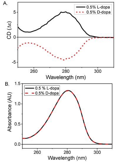 (A), CD and (B), UV absorbance spectra of 0.5% D- and L-dopa aqueous solutions.