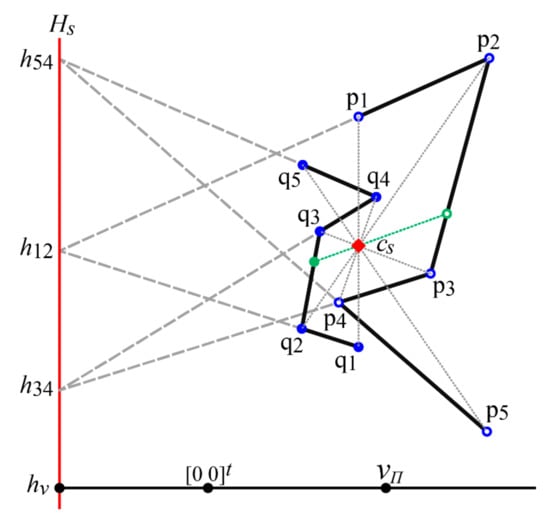 Now consider n corresponding pairs of points (p1, p2, … pn) on φ and (q1, q2, … qn) on ψ where n ≥ 3 (Figure 4). They are projections of points (P1, P2, … Pn) on Φ and (Q1, Q2, … Qn) on Ψ. Draw a line connecting two of the points pi and pj on φ and a line connecting their corresponding points qi and qj on ψ (the dashed gray lines in Figure 4). The intersection hij of these two lines is a vanishing point of two parallel lines connecting Pi and Pj and connecting Qi and Qj. These lines are on the planes ΠΦ and ΠΨ individually, and they are parallel to one another. It follows that hij is on a line Hs (the solid red line in Figure 4) that is a common horizon of ΠΦ and ΠΨ. Another vanishing point can be found by drawing a line connecting different points on φ and by drawing a line connecting their corresponding points on ψ. An additional corresponding pair of points on φ and ψ can be determined by drawing a line (the dotted green line in Figure 4) passing cs and finding its intersection with φ and ψ if necessary.