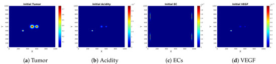 We solve System (25) with no-flux boundary conditions and with the initial data given above on a square domain (in m) using a finite difference method. The diffusion parts of acidity (here and subsequently, we mean by “acidity” the concentration of protons, keeping in mind its relationship to the corresponding pH value; the latter usually refers to “acidity” in medical practice), ECs and VEGF are discretized using a standard central difference scheme, while a nonnegativity-preserving discretization scheme, as proposed in [48], is used for the anisotropic diffusion of glioma cells. We apply a first order upwind scheme for the taxis terms in glioma and EC equations. For time discretization, an Implicit-explicit (IMEX) scheme is used for the acidity, EC, and VEFG equations, thereby treating the diffusion parts implicitly and discretizing the taxis and source terms with an explicit Euler method. We use an explicit Euler scheme for each term in the glioma equation.