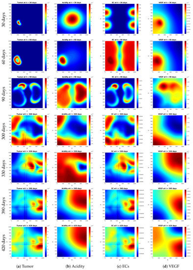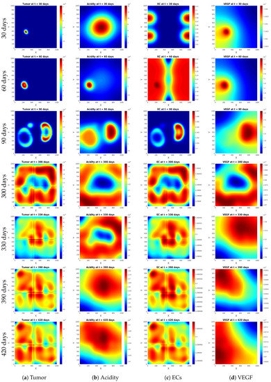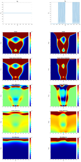 where , constants, by dynamics of quantities involved in angiogenesis, i.e., ECs and VEGF. Figure 4 shows differences between glioma density and proton concentration computed with Model (25) and with model versions without vascularization, namely Model (29) (for the left part of Figure 4) and, respectively,