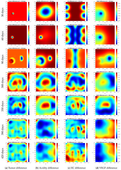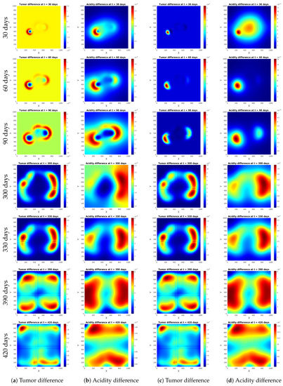 Experiment 3: effect of angiogenesis. Left columns: Difference between tumor density and acidity concentration, as obtained with full System (25), and those computed from the variant Model (29) with proton uptake rate /h. Right columns: Same differences, but between computations done with Equation (25) and with Equation (30).