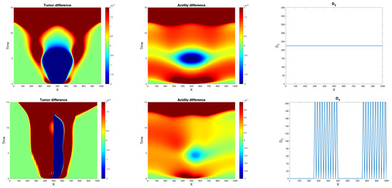 1D patterns for two different choices of the glioma diffusion coefficient . 2nd row: tumor patterns for Model (25). 3rd row: tumor patterns when Equation (25a) is replaced by Model (31). 4th row: differences between respective patterns in rows 2 and 3. 5th and 6th rows: differences between acidity and EC densities computed with Model (25) and with Model (31) replacing Equation (25a).