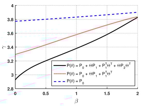 with ⊗ denoting the Kronecker product and , , , , , and being known constant matrices. It will be considered that the matrices and in (22), are quadratic functions of , whereas is affine in , which without loss of generality can be parameterised as follows: