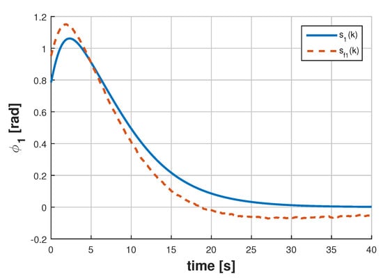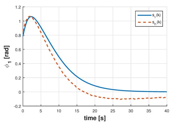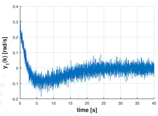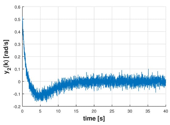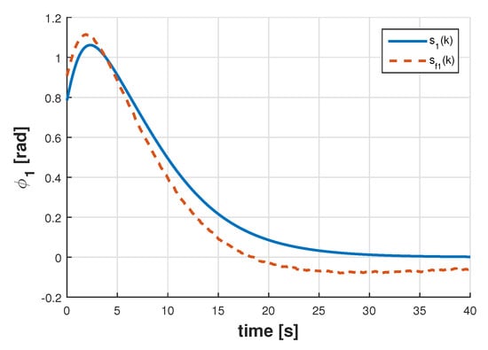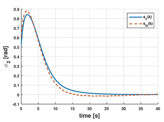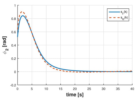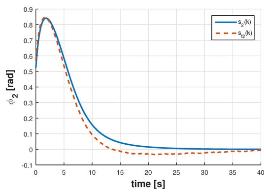 Figure 6 displays the estimate of the signal along with , whereas the signals and and shown in Figure 7. The results for the full-order filter are displayed in Figure 8 and Figure 9, and in Figure 10 and Figure 11 are depicted the results corresponding to the reduced-order filter. Notice in this particular example that the designed filters have obtained reasonably good estimates of the joint angles despite noisy measurements demonstrating the effectiveness of the proposed approach in a more practical scenario.