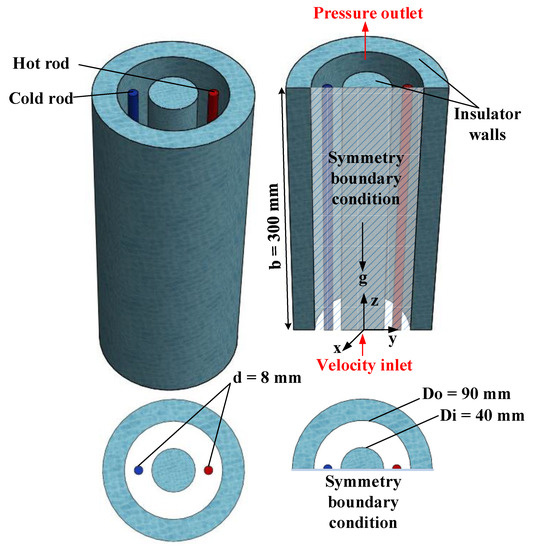 Figure 1 demonstrates a basic and simulated three-dimensional cylindrical shape cavity (annulus) equipped with hot and cold rods in the present study. In the present paper, this geometry is analyzed using a symmetry boundary condition. Figure 1 shows, on the right side, a schematic diagram of the studied configuration. The height of the cylinder is changed from 300 mm. Additionally, the height of the square is changed from 46.03 to 70.71 mm, the length of the square is 1000 mm, and the gravity influences are determined in z direction. This is a hypothetical geometry and was designed by the authors of the article. However, it has many applications in electrical components and electronics industries. The system is made of an insulator in the center and outer sides of the cylinder, with a boundary condition of zero heat flux. However, this material is presumed with two dissimilar emissivity values of 0.2 and 0.5 for analyzing its influences on radiation heat transfer. Moreover, two dissimilar Reynolds numbers, Re = 3000 and 4000, are in transient regime. The initial NF temperature is Tinitial = 350 K and the cold side temperature is Tc = 300 K. The hot side temperature can be Th = 430 K. The heat transfer fluid is a water-, ethylene–glycol-, or water/ethylene–glycol mixture-based Cu-Al2O3 HNF, which creates a Newtonian NF. To attain the most proficient Newtonian NF in the current research, Cu and Al2O3 nanoparticles were added to the base fluid in different volume concentrations of 0.01 to 0.05 with diameters of 24 nm. Table 1 presents the thermophysical features of the base fluid and nanoparticles.
