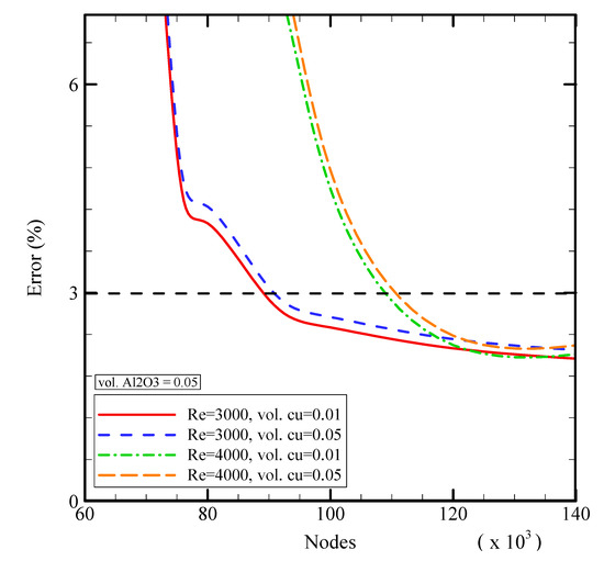 As displayed in Figure 2, a grid independency study was implemented for the studied cavity containing Al2O3-Cu/water HNF to examine the influences of mesh sizes on the findings. For the validation, the emissivity of the cylinder is constant and equal to 0.2. Additionally, the volume fraction of the Al2O3 nanoparticles is 0.05. A non-uniform structured mesh was used for the channel. Moreover, the near-wall mesh was fine enough to be able to resolve the viscous sublayer (). As observed, several meshes have been tested versus different Reynolds numbers and volume concentrations of Cu nanoparticles. Finally, it was determined that the mesh configurations, including 113,285 nodes, had acceptable precision with a maximum error of 3%.