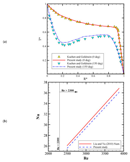 In addition, Figure 3b illustrates Nusselt number variation versus Reynolds number (2500 < Re < 3900) to validate the obtained results in the present work and the numerical data of Liu and Yu [55] in the transient flow regime. It is seen clearly that there is a good agreement between the obtained results from reference [55] and the numerical data in the present investigation.