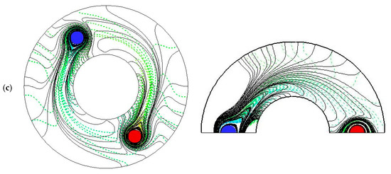 Figure 4 illustrates streamlines and isotherm lines at different cross-sections of the studied cylinder for the case filled with Al2O3-Cu/water HNF at = 0.05, = 0.01, = 0.2, and Re = 3000. As seen in this figure, HNF flow and heat transfer through the z-direction of the cylinder are developed. Additionally, the calculations show that different vortexes are through the annulus. The main heat transfer mechanism in the annulus is convection and the next one is radiation. However, the portion of radiation heat transfer is sharply lower than the convective mechanism. In addition, the presence of rods leads to more heat transfer because of vortexes being made. Rods are like obstacles that destroy the laminar sublayers and make local turbulence which enhance the convective heat transfer coefficient in the annulus and intensify the Nu. Figure 5 illustrates streamlines and isotherm lines at different cross-sections of the studied cylinder for the case filled with Al2O3-Cu/water HNF at = 0.05, = 0.01, = 0.2, and Re = 4000. As seen in this figure, HNF flow and heat transfer through the z-direction of the cylinder are developed. Additionally, the calculations show that different vortexes are through the annulus. The main heat transfer mechanism in the annulus is convection and the next one is radiation. However, the portion of radiation heat transfer is sharply lower than the convective mechanism. Additionally, the presence of rods leads to more heat transfer because of vortexes being made. Rods are like obstacles that destroy the laminar sublayers and make local turbulence which enhance the convective heat transfer coefficient in the annulus and augment the Nu. Additionally, it is realized that higher Reynolds numbers lead to more heat transfer coefficients because of more vortexes and turbulence through the cylindrical annulus. By comparing the streamlines and isotherm lines in Figure 4 and Figure 5, some similarities between them are clearly seen.