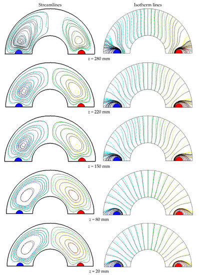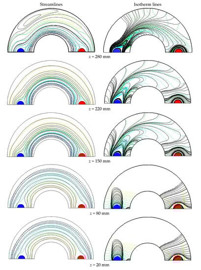 Streamlines and isotherm lines at different cross-sections of the studied cylinder for the case filled with Al2O3-Cu/water HNF at = 0.05, = 0.01, = 0.7, and Re = 4000.
