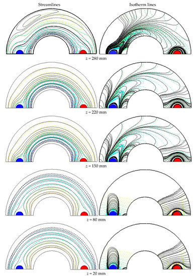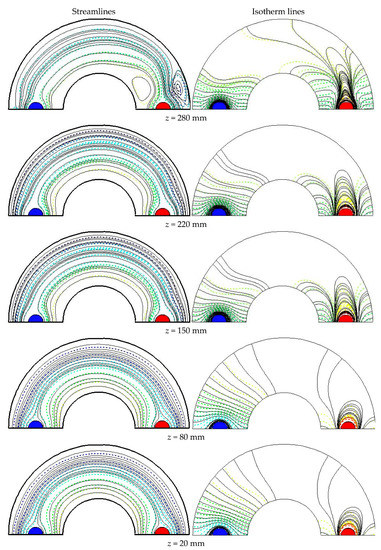 Streamlines and isotherm lines at different cross-sections of the studied cylinder for the case filled with Al2O3-Cu/water HNF at = 0.05, = 0.01, = 0.2, and Re = 3000.