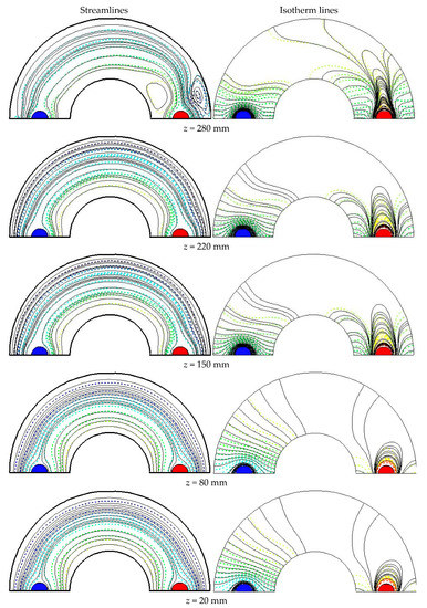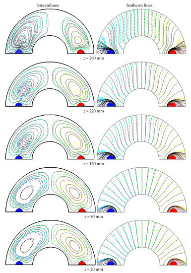 Figure 7 illustrates the streamlines and isotherm lines at different cross-sections of the studied cylinder for the case filled with Al2O3-Cu/water HNF at = 0.05, = 0.01, = 0.7, and Re = 3000. As seen in this figure, HNF flow and heat transfer through the z-direction of the cylinder are developed. Additionally, the calculations show that different vortexes are through the annulus. The main heat transfer mechanism in the annulus is convection and the next one is radiation. However, the portion of radiation heat transfer is sharply lower than the convective mechanism. In addition, the presence of rods leads to more heat transfer because of vortexes being made. Rods are like obstacles that destroy the laminar sublayers and make local turbulence which enhance the convective heat transfer coefficient in the annulus and augment the Nu. Figure 8 illustrates streamlines and isotherm lines at different cross-sections of the studied cylinder for the case filled with Al2O3-Cu/water HNF at = 0.05, = 0.01, = 0.7, and Re = 4000. As seen in this figure, HNF flow and heat transfer through the z-direction of cylinder are developed. Additionally, the calculations show that different vortexes are through the annulus. The main heat transfer mechanism in the annulus is convection and the next one is radiation. However, the portion of radiation heat transfer is sharply lower than the convective mechanism. Additionally, the presence of rods leads to more heat transfer because of vortexes being made. Rods are like obstacles that destroy the laminar sublayers and make local turbulence which enhance the convective heat transfer coefficient in the annulus and augment the Nu. Additionally, it is realized that higher Reynolds numbers lead to more heat transfer coefficients because of more vortexes and turbulence through the cylindrical annulus. By comparing the streamlines and isotherm lines in Figure 7 and Figure 8, some similarities between them are clearly seen. As noted previously, the portion of radiation heat transfer inside the studied cylinder is significantly lower than the convection heat transfer. Therefore, variations in emissivity values do not have an important influence on HNF flow and heat transfer distribution inside the cylindrical annulus, which is shown clearly by comparing Figure 4, Figure 5, Figure 7, and Figure 8 with each other. Higher emissivity values should lead to higher radiation heat transfer, but the portion of radiative heat transfer in the studied annulus is low and therefore, does not have an observable increment in HNF flow and heat transfer.