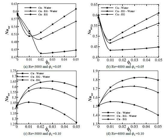 - For the model at Re = 4000 and = 0.05, all studied cases with different base fluids have similar behavior. For all studied cases, the total Nuave reduces firstly by an increment of the volume concentrations of Cu nanoparticles until = 0.01 and then, the total Nuave rises by an increment of the volume concentrations of Cu nanoparticles.