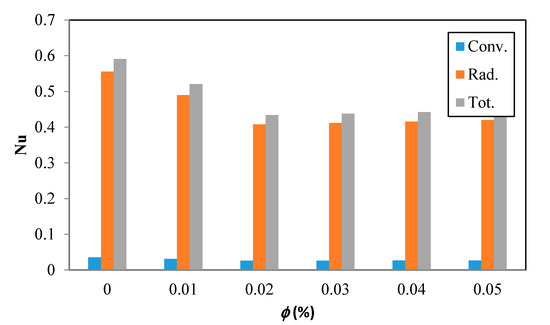 Figure 11 shows different portions of the predicted Nu versus different volume fractions of Cu nanoparticles of the studied cylinder for the case filled with ethylene glycol-based HNF at = 0.05, = 0.2, and Re = 3000. It is seen that just about 5 to 7% of the total average Nusselt number is related to radiation heat transfer and a huge portion is related to convection heat transfer. This is why variations of emissivity coefficient do not have a significant effect on the final results.