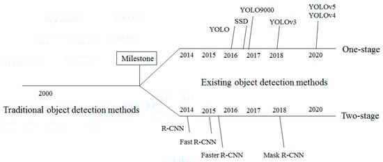 The rapidly developing technology of deep learning has been widely applied in recent years. As a novel field of study, deep learning seeks to analyze and interpret data by mimicking and simulating the way in which the human brain operates. The core aspect of deep learning is to train multilayer neural network models using large volumes of data to determine input-output relationships. The number of layers in a model, the number of neurons in each layer, how the neurons are connected, and how the functions are simulated and determined based on the problem at hand. The weights and biases of each layer are updated using large volumes of data. Deep learning has been extensively applied and has contributed to the development of image recognition and object detection technologies, which utilize convolutional neural networks (CNNs) as a basis for extracting the features of an image [1]. The objective of image recognition is to acquire information from an image (the information of the object with the most prominent features); the objective of object detection is to acquire more information from multiple objects in an image, such as acquiring the precise position and attributes of each target object in an image. While the history of object detection dates back 20 years, major breakthroughs were only achieved in 2014, during which enhancements in the computational capability of a graphics processing unit (GPU), as well as advancements in deep learning-based image recognition techniques, were attained. For this reason, the year 2014 is considered a watershed moment in the field of object detection, marking the shift from traditional methods to deep learning-based methods. Figure 1 depicts the developmental history of object detection algorithms.