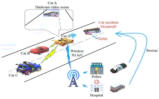 As shown in Figure 2, as Car A moves along a highway, the smart detector on the dashcam onboard detects an overturned car in front and labels it in the video (see the inlet picture titled Car A Dashcam video scene). Then, Car A would intelligently assist the driver to brake in time instead of performing sudden braking, which could lead to skidding and secondary accidents. At the same time, the accident is relayed to other cars behind (Cars B and C) using wireless messaging. Lastly, it is recommended that the accident message is sent through 5th generation mobile network (5G) Internet of Vehicles (IoV) [32] to a base station nearby, which in turn consolidates the data and sends it to the cloud platform of the police and hospitals, allowing them to deploy rescue teams. This study focuses on the detection and classification of accidents, and as for the other topics that were brought up (e.g., base station transmission [33]), they could be further explored in future studies.