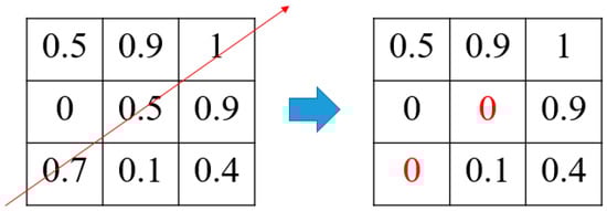 Then, non-maximum suppression (NMS) was used to compare each pixel along the derived direction of , to check whether a pixel value was the maximum along the gradient direction. Such a pixel has a higher retained intensity than those of its neighboring pixels. This process is known as edge thinning (as depicted in Figure 4).