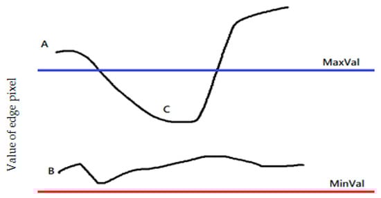 Lastly, the double thresholds minVal (T1) and maxVal (T2) were used to screen for actual edges. Figure 5 shows an image with edges. Point A has a value higher than T2 and is a point on an actual edge. Even though the value of Point C is between the two thresholds, it is connected to Point A, and is also regarded as a point on edge. The value of Point B is lower than T2, is not connected to any point, and is regarded as a non-edge point. Points smaller than T1 are omitted. This was done to connect different edges, as using a single threshold could result in an image with many intermittent edge lines.