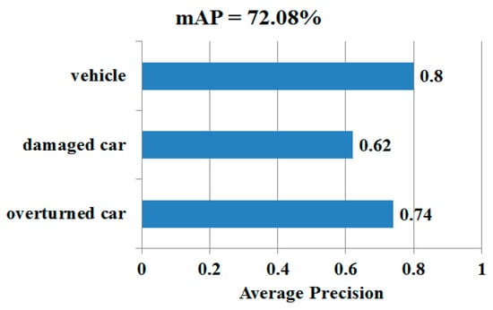 In addition to using images based on the angle of view of dashcams, this study also performed tests on the models’ accident detection ability by using single high-resolution images, which is a common approach employed in many studies. Having attained an mAP of 72.08%, and as indicated by the experimental results discussed above, the proposed model was able to achieve a level of detection precision that is considered acceptable for existing image recognition techniques.