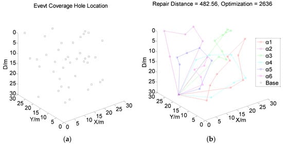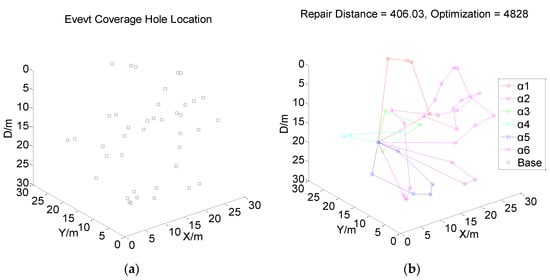 Figure 1, Figure 2, Figure 3 and Figure 4 present the distribution of underwater event coverage holes and multi-AUV repair strategies under four multi-constraint situations. Figure 1a, Figure 2a, Figure 3a and Figure 4a present the allocation of the UECHs in four different situations. The squares in the figure indicate the position of the UECHs. Figure 1b, Figure 2b, Figure 3b and Figure 4b present the multi-AUV repair strategy aiming at four different underwater situations. Six AUVs set off from the base position at the same time. Each AUV carries a type of sensor to repair a total of forty UECHs in the UWSNs. The multi-color routes in Figure 1b, Figure 2b, Figure 3b and Figure 4b present the repair route of six AUVs.