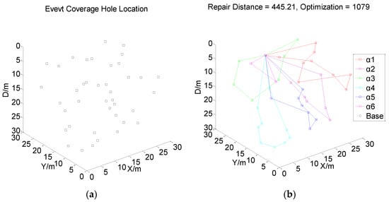 Due to the consumption of land resources and the maturity of event monitoring technology, event monitoring research has progressively shifted from the land to the ocean [,]. Event monitoring in the underwater wireless sensor networks (UWSNs) has gradually become a novel research focus. With the continuous changes in underwater monitoring missions and demands, a large number of underwater event coverage holes (UECHs) will be generated in the UWSNs. Traditional research on coverage hole repair in sensor networks is mostly aimed at repairing coverage holes in a fixed two-dimensional unconstrained scene []. In the real world scene, it is essential to apply multiple types of sensors to detect events in the underwater environments with the optimal repair strategy according to various event monitoring demands, such as military intrusion monitoring, environmental monitoring, fish monitoring, and underwater rescue []. At the same time, due to the particularity of the underwater environments, the repair process based on multi-AUVs in the underwater environments will be limited by multiple types of harsh constraints. The traditional repair methods mostly use manpower redeployment repair and aircraft airdrop repair. Underwater sensor networks are mostly applied in perilous and harsh environments. Repairing the underwater event coverage holes by divers is costly, time-consuming, and highly perilous. The repair accuracy when being carried out by random airdrops is not satisfactory. Not only are the initial UECHs hard to repair, but also superfluous sensors waste a large number of network resources in UWSNs. With the maturity of underwater robot technology, multiple autonomous underwater vehicles (multi-AUVs) have been widely applied in UWSNs. Multi-AUVs can not only work in harsh and perilous underwater environments, but also quickly sail to accurate locations. Therefore, multi-AUVs are applied to accurately repair the UECHs in the underwater environments.
