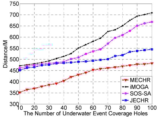 The multi-agent event coverage hole repair algorithm (MECHR) algorithm made a comparison with the inexact Multi-Objective Genetic Algorithm (iMOGA), Symbiotic Organisms Search (SOS) with Simulated Annealing algorithm (SOS-SA), and Joint Event Coverage Hole Repair algorithm (JECHR) algorithms in terms of repair route distance under different amounts of underwater event coverage hole (UECHs).