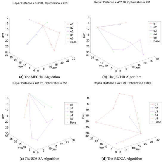 It can be seen from Figure 5 that the muiti-AUVs repair distance decreases rapidly in the initial optimization stage. With the continuous repair process, the muiti-AUVs repair distance continues to slow down and stabilize. Then, the repair route distance of UECHs decreases stably. There is no problem of local optimum and continuous oscillation. This is because it is often difficult to balance the diversity and convergence of the solution set when repairing a large amount of UECHs. In response to this problem, the multi-agent strategy and diversity archive strategy are combined in the MECHR algorithm. In the multi-agent strategy, each agent is responsible for the task of guiding the subpopulation to evolve toward the real Pareto frontier along the specified reference vector, which effectively enhances the convergence of the population, and the reference vectors are evenly distributed in the target space. The subpopulations in different agents can maintain better diversity. Through the process of gathering individuals who perform different tasks every few generations into the diversity archive and updating the archive, the diversity of the population can be effectively maintained. The updated diversity archive redistributes individuals to different agents. The migration of good individuals between different tasks in this process can effectively improve the performance of the algorithm. Finally, in Figure 5a, the first situation is optimized 3465 times. The multi-AUVs repair distance is 398.05 m; in Figure 5b, the second situation passes through 4828 optimizations. The repair route distance is 406.03 m; in Figure 5c, the third situation goes through 1079 optimizations. The repairc route distance is 445.21 m; in Figure 5d, after 2636 optimizations, the repair route distance of the fourth situation is 482.56 m.